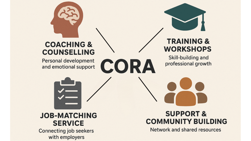 CORA delivers an integrated model that combines professional training, career coaching, psychological counseling, community building, and direct job pathways.